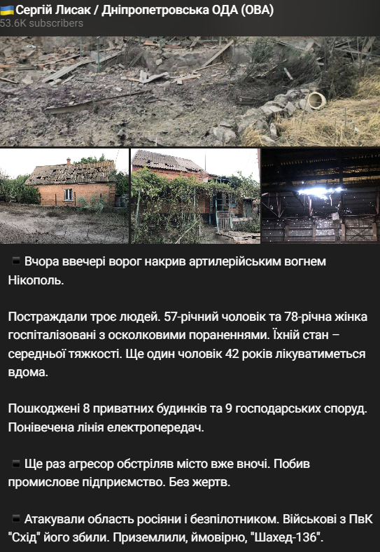 Вечером, 21 июля, россияне обстреляли из артиллерии Никополь. В результате обстрела пострадали трое мирных жителей.
