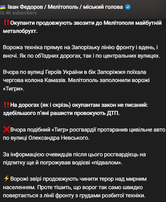 Сообщается, что вчера колонны КамАЗов проехали по улице Героев Украины в сторону Запорожья. Мелитополь также заполонили вражеские "Тигры".