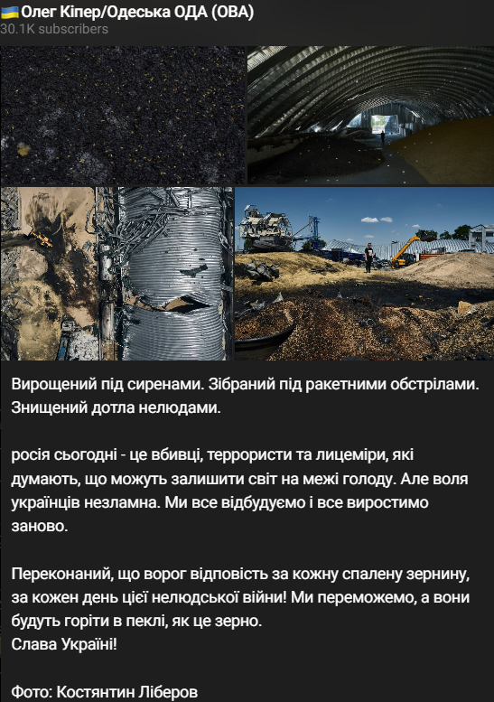 "Выращен под сиренами. Собран под ракетными обстрелами. Уничтожен дотла извергами. Россия сегодня - это убийцы, террористы и лицемеры, которые думают, что могут оставить мир на грани голода. Но воля украинцев несокрушима. Мы все отстроим и все вырастим заново" - написал Кипер.