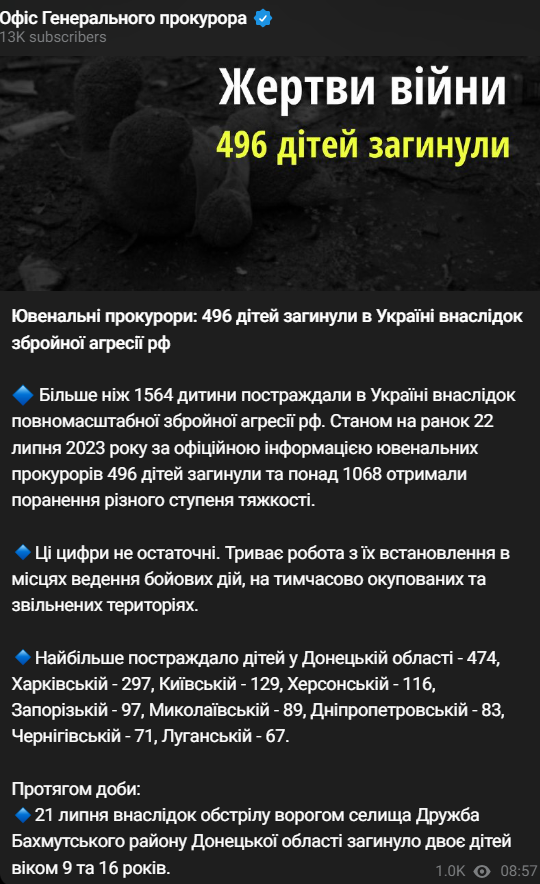 В Украине в результате вооруженной агрессии РФ погибли 496 детей и более 1068 получили ранения разной степени тяжести.