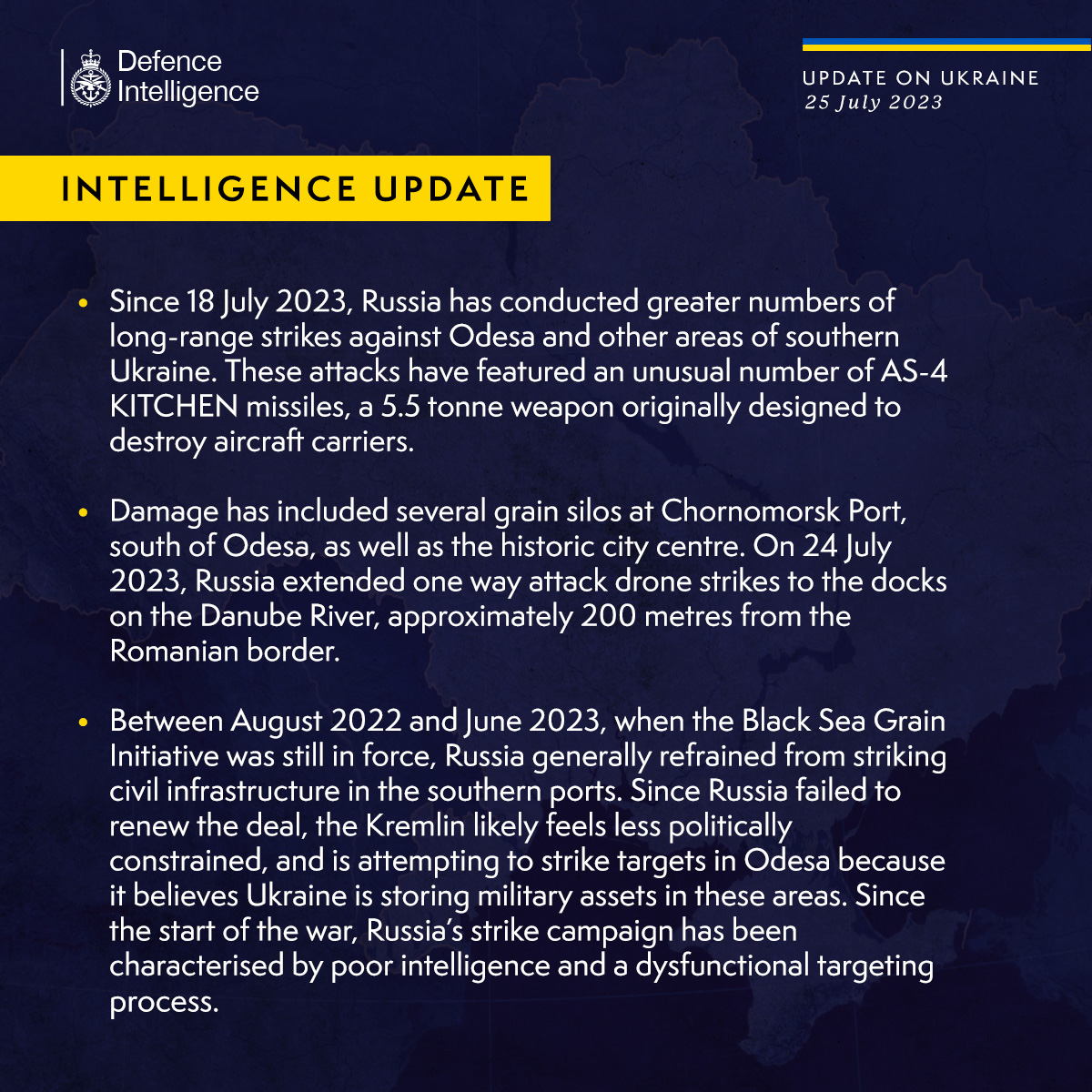 По данным британской разведки, в период с августа 2022 года по июнь 2023 года, когда еще действовала Черноморская зерновая инициатива, Россия в целом воздерживалась от нанесения ударов по объектам гражданской инфраструктуры в южных портах.