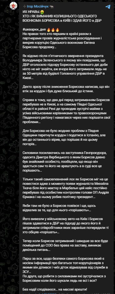 По его информации, за пару дней до ареста Борисов был на юге Одесской области, где собирался, договорившись с местными силовиками, выехать за границу.