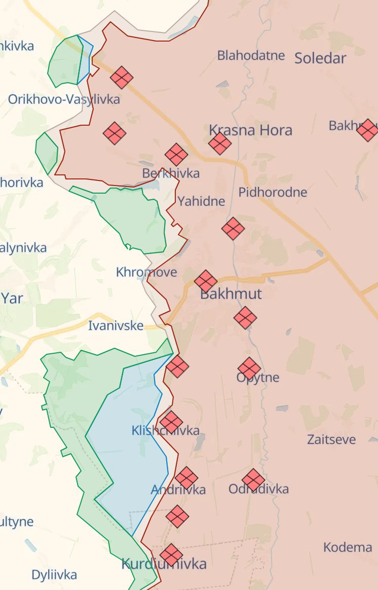 Судя по карте украинских военных телеграм-каналов, южнее Бахмута глубоко вклиниться в оборону противника для обходного маневра пока не получилось, а севернее российские позиции образуют уходящий на запад выступ в районе Орехово-Василевки.