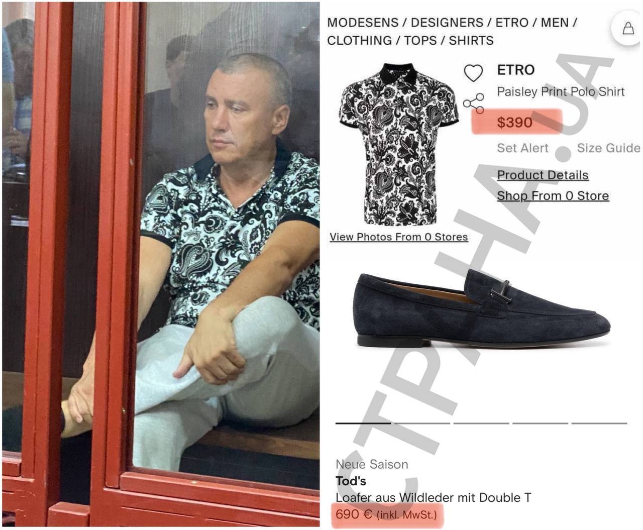 Подозреваемый Борисов предстал в зале суда в рубашке поло итальянского бренда Etro за $390 старомодной расцветки пейсли (или, по народному, в турецкий огурец). Что касается обуви, то замшевые мокасины на бОрисове, похоже, от именитой итальянской марки обуви Tod’s и стоят €690.