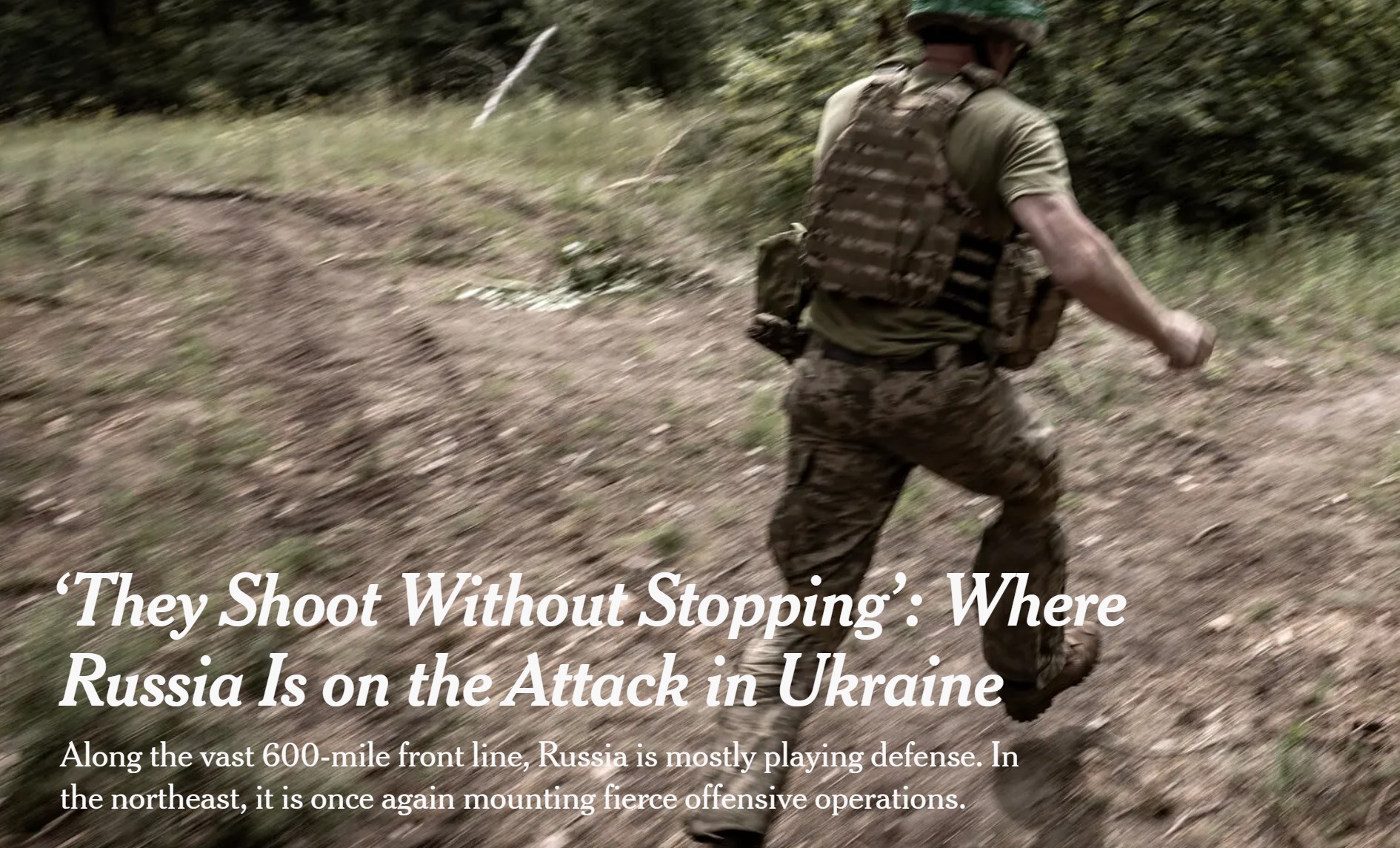 В статье говорится, что на северо-востоке РФ ведет "устойчивые наступательные операции" и "стреляет без остановки" - подчас втрое интенсивнее, чем украинские подразделения. Военврачи говорят о резком росте раненых на этом участке, хотя раньше их там было мало.