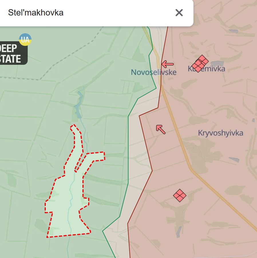 Сегодня утром паблик подтвердил свои данные и заявил, что россияне настроились на захват Стельмаховки (севернее обсуждаемого участка). Минобороны РФ заявило, что россияне "заняли более выгодные позиции" рядом со Стельмаховкой, в районе Куземовки.