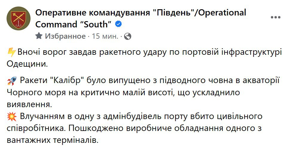"Ракеты "Калибр" были выпущены из подлодки в акватории Черного моря на критически малой высоте, что затруднило обнаружение", - сообщило оперкомандование "Юг".
