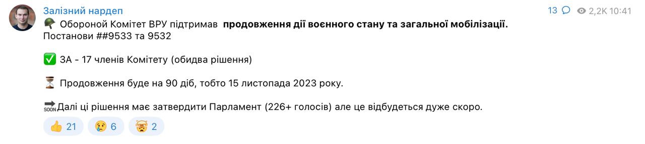 11.03 Парламентский комитет поддержал продление военного положения и мобилизации в Украине до 15 ноября.