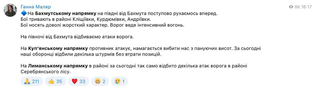 Западные СМИ пишут, что там накануне усилилось наступление ВСУ. Об этом же сегодня заявил Путин. Но Маляр сообщает только, что ВСУ продолжают двигаться южнее Бахмута и отбивают атаки севернее города.