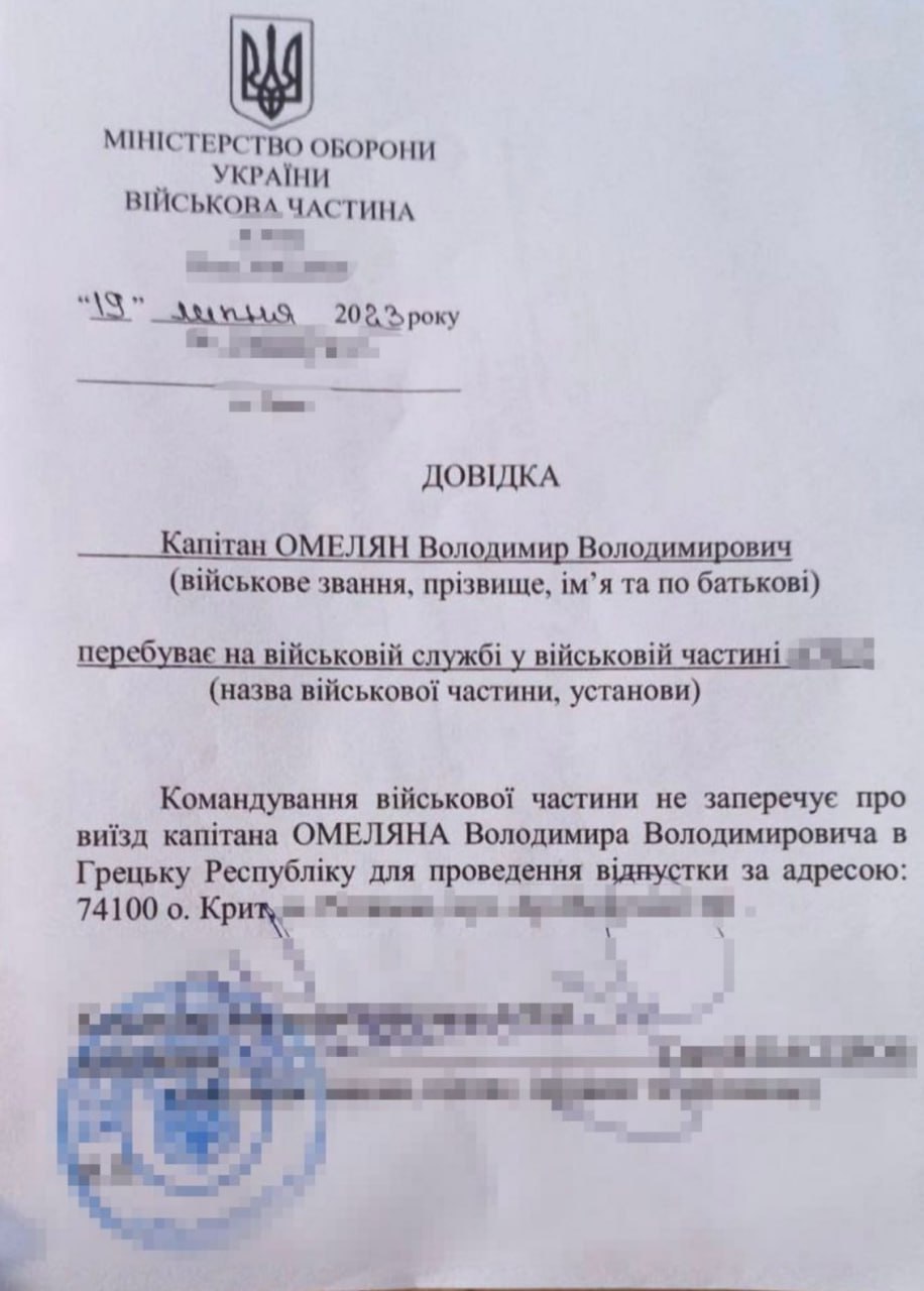 Там указано, что командование воинской части, расположенной в Ровно, не возражает, чтобы 17 дней из положенного ему отпуска Омелян провел на Крите, в городе Ретимно.
