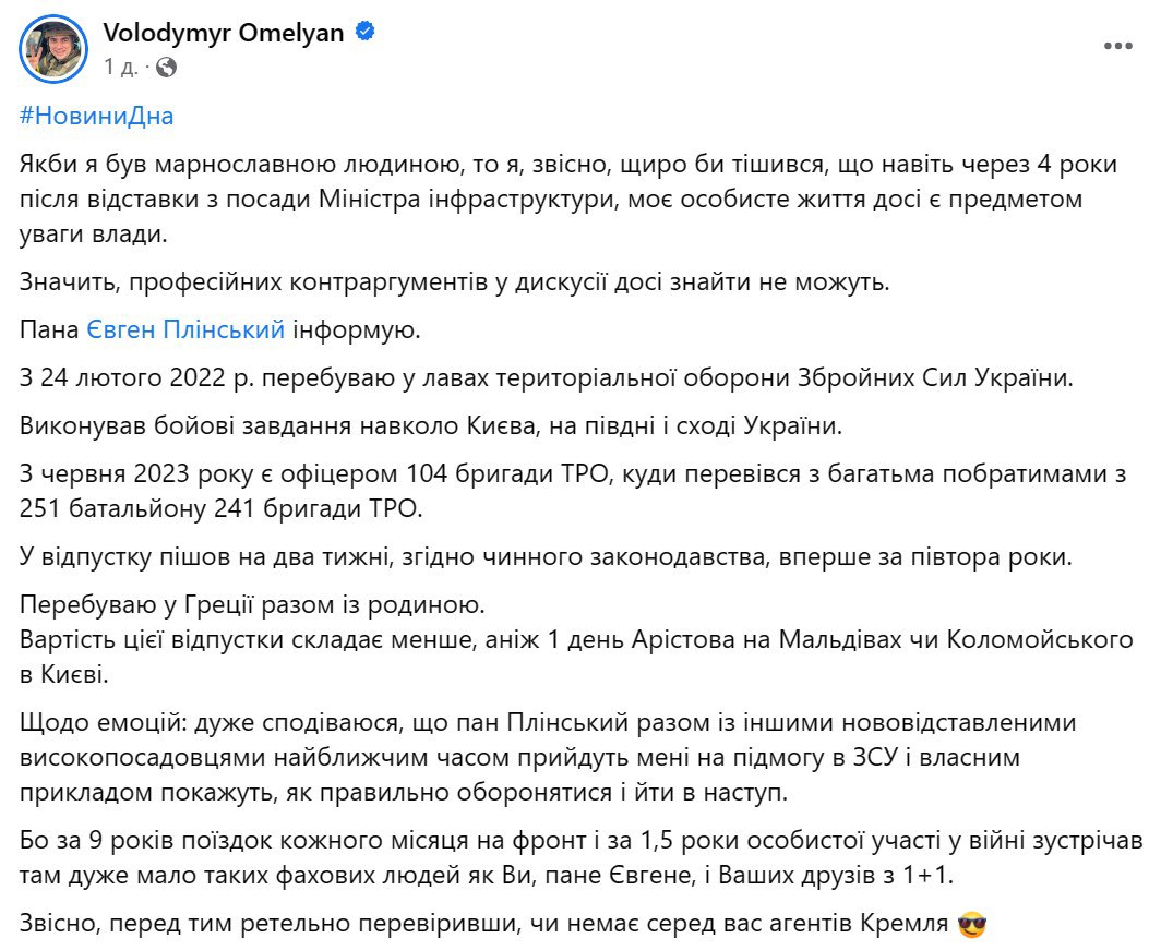 Экс-министр инфраструктуры Владимир Омелян, который служит капитаном ВСУ, убыл в отпуск на остров Крит.