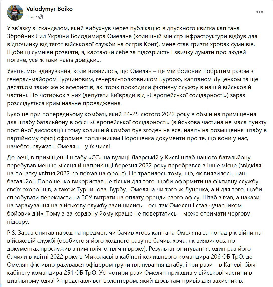 "Сейчас опросил народ на предмет, видел ли кто-то капитана Омеляна за год войны на военной службе (лично я его ни разу не видел, хотя, как оказалось, по документам прослужил с ним бок о бок полгода). Результат опроса: один раз его видели в апреле 2022 года в Николаеве в кабинете бывшего командира 206 ОБ ТрО, где Омелян фиктивно считался офицером группы планирования штаба, и три раза – в Каневе, у кабинета командира 251 ОБ ТрО. Все четыре раза Омелян приезжал в воинские части в гражданской одежде и представлялся волонтером, который что-то там привез для защитников", - пишет Бойко.