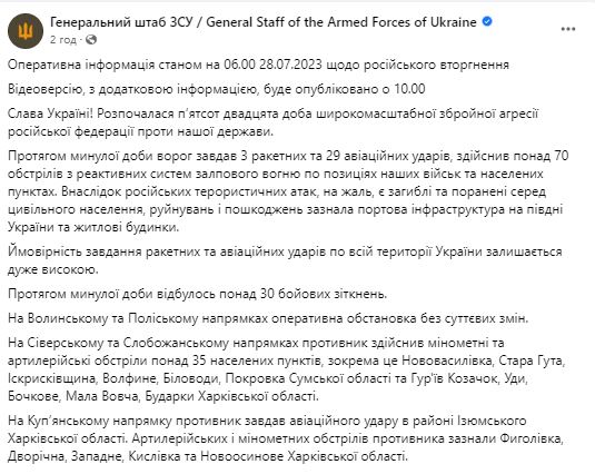 Утром 28 июля Генштаб ВСУ обнародовал сводку о ситуации на фронте.