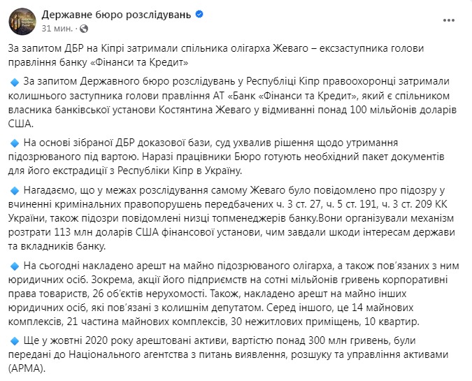В ГБР напомнили, что в рамках расследования самому Жеваго было сообщено о подозрении в совершении уголовных правонарушений, предусмотренных ч. 3 ст. 27, ч. 5 ст. 191, ч. 3 ст. 209 УК Украины, а также подозрения сообщены ряду топ-менеджеров банка. Они организовали механизм растраты 113 млн долларов США финансового учреждения, чем нанесли ущерб интересам государства и вкладчиков банка.