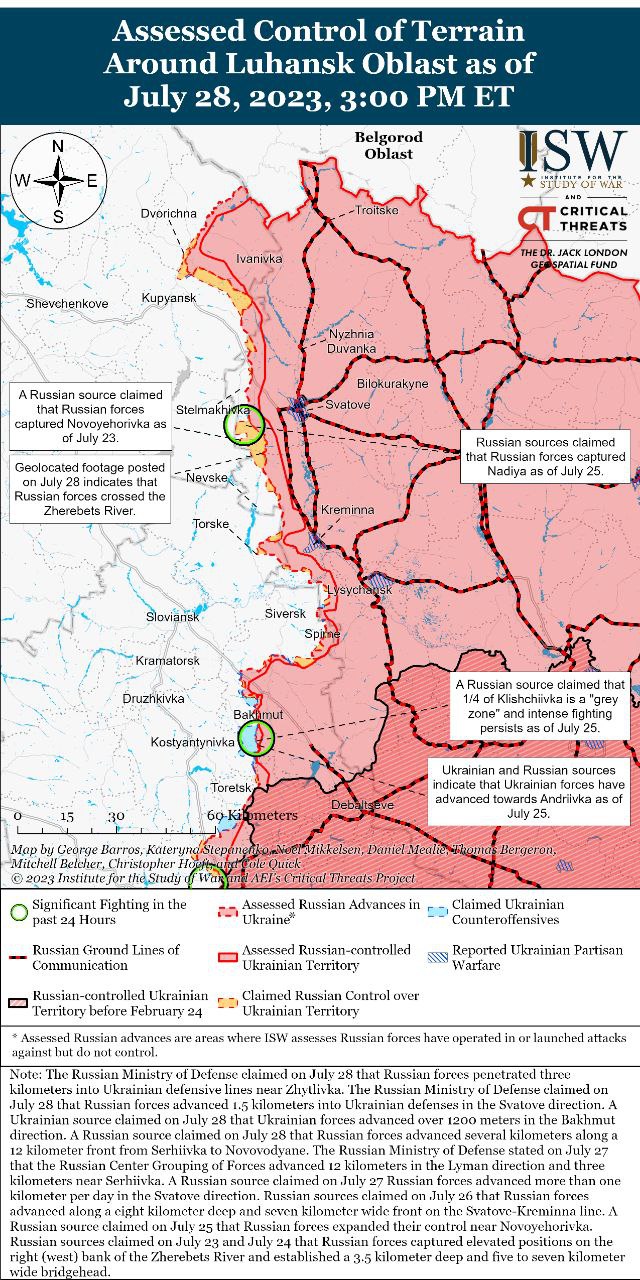 "На кадрах с геолокацией, опубликованных 28 июля, видно, как российские подразделения 21-го мотострелкового полка (2-я общевойсковая армия, Центральный военный округ) переправляются через реку Жеребец юго-западнее н. п. Кармазиновка", - говорится в отчете ISW.