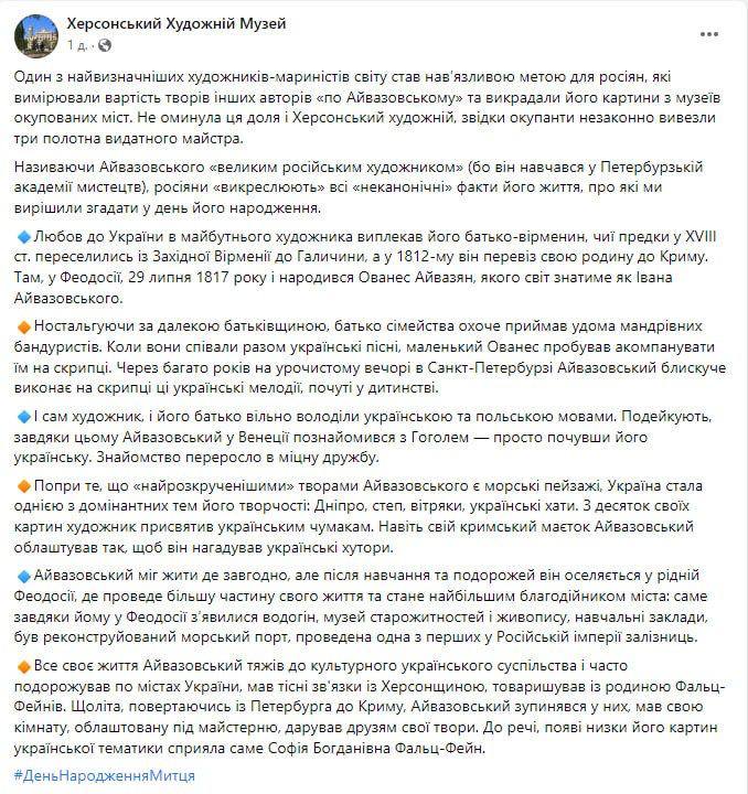 Херсонский художественный музей обвинил россиян в незаконном вывозе из музея трех картин Ивана Айвазовского.
