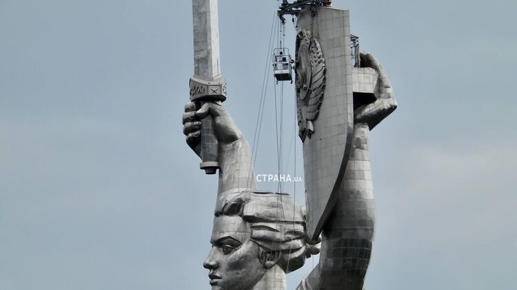 В воскресенье, 30 июля, в Киеве начался демонтаж советского герба на монументе "Родина-Мать".