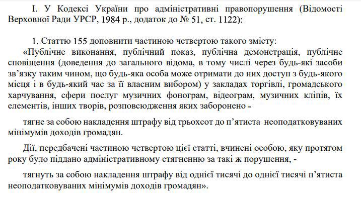 Авторы предлагают дополнить Кодекс об административных нарушениях новым положением, в котором говорится, что использование запрещённого музыкального продукта (фонограмм, видеограмм, музыкальных клипов, их элементов) влечет за собой штраф от 300 до 500 необлагаемых налогом минимумов. За повторное нарушение грозит штраф от 1000 до 1500 необлагаемых налогом минимумов.