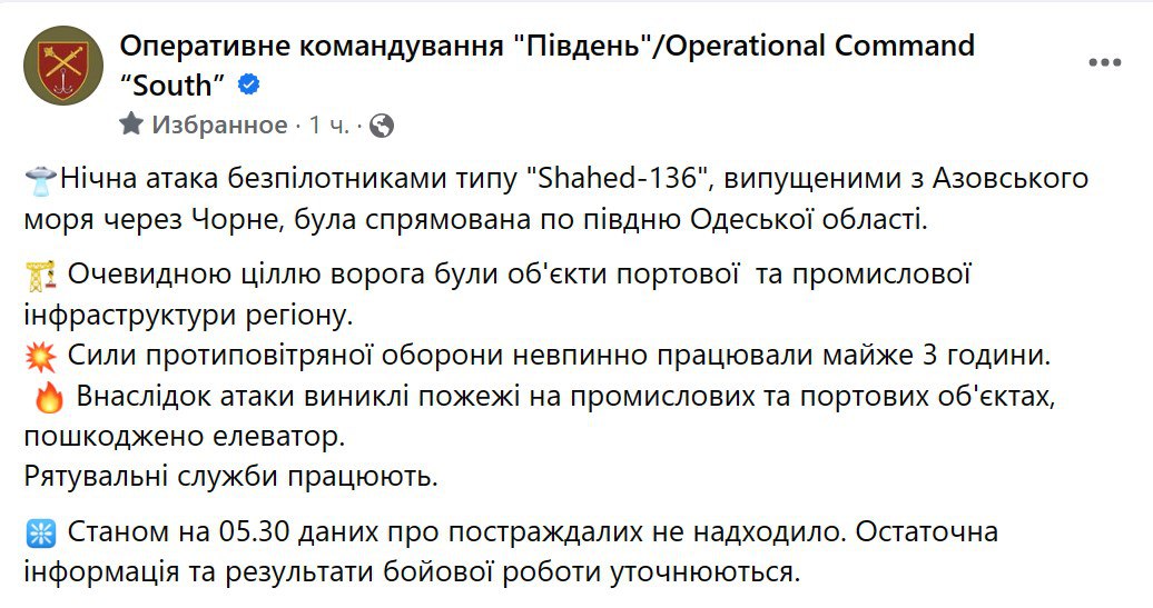 07.37 По ночному налету "Шахидов" на юге Одесской области.