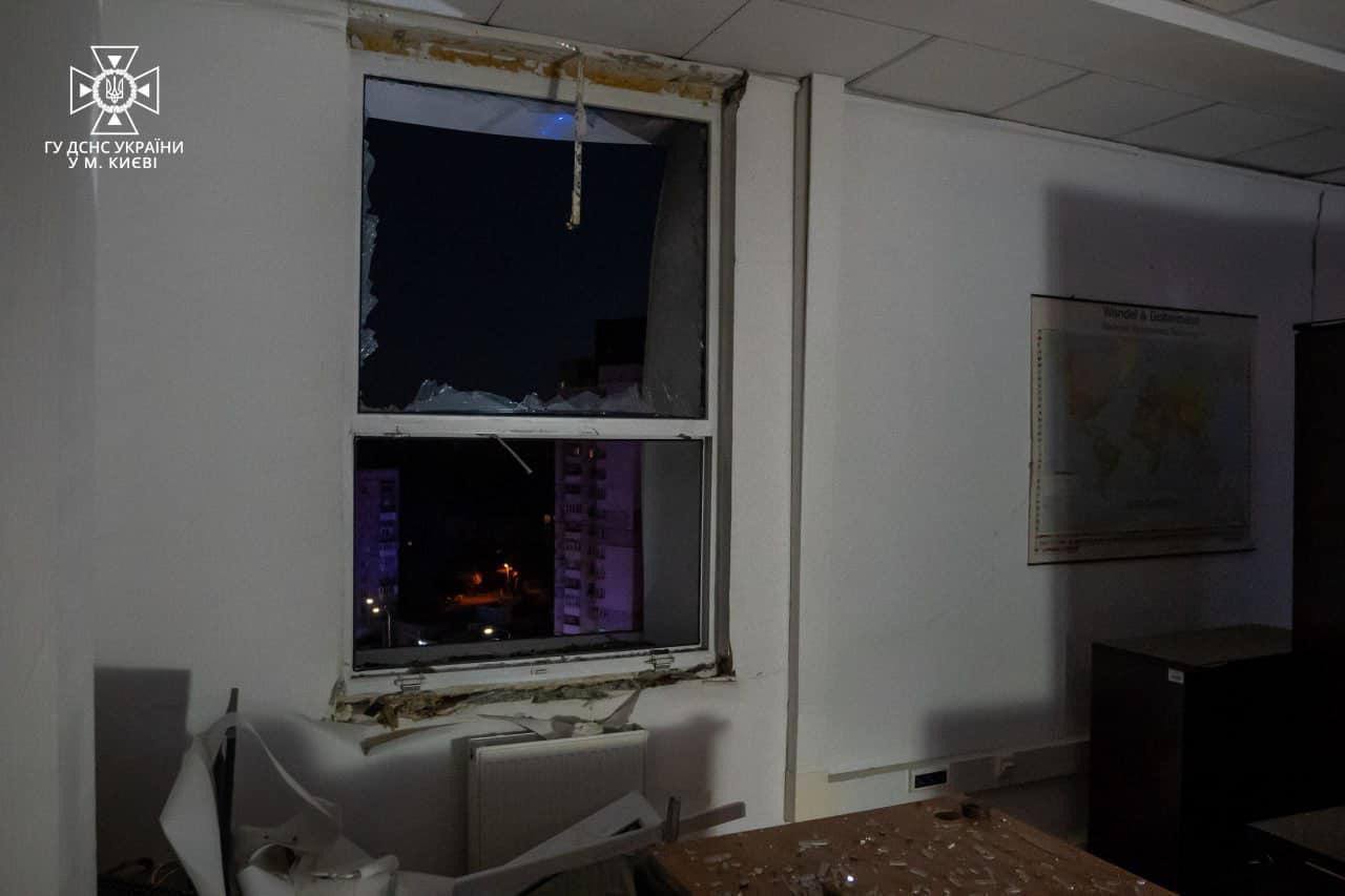 08.40 Во время падения обломков "Шахида" на Киев поврежден фасад админздания, сообщили в ГосЧС. Пострадали окна с 9 по 11 этаж.