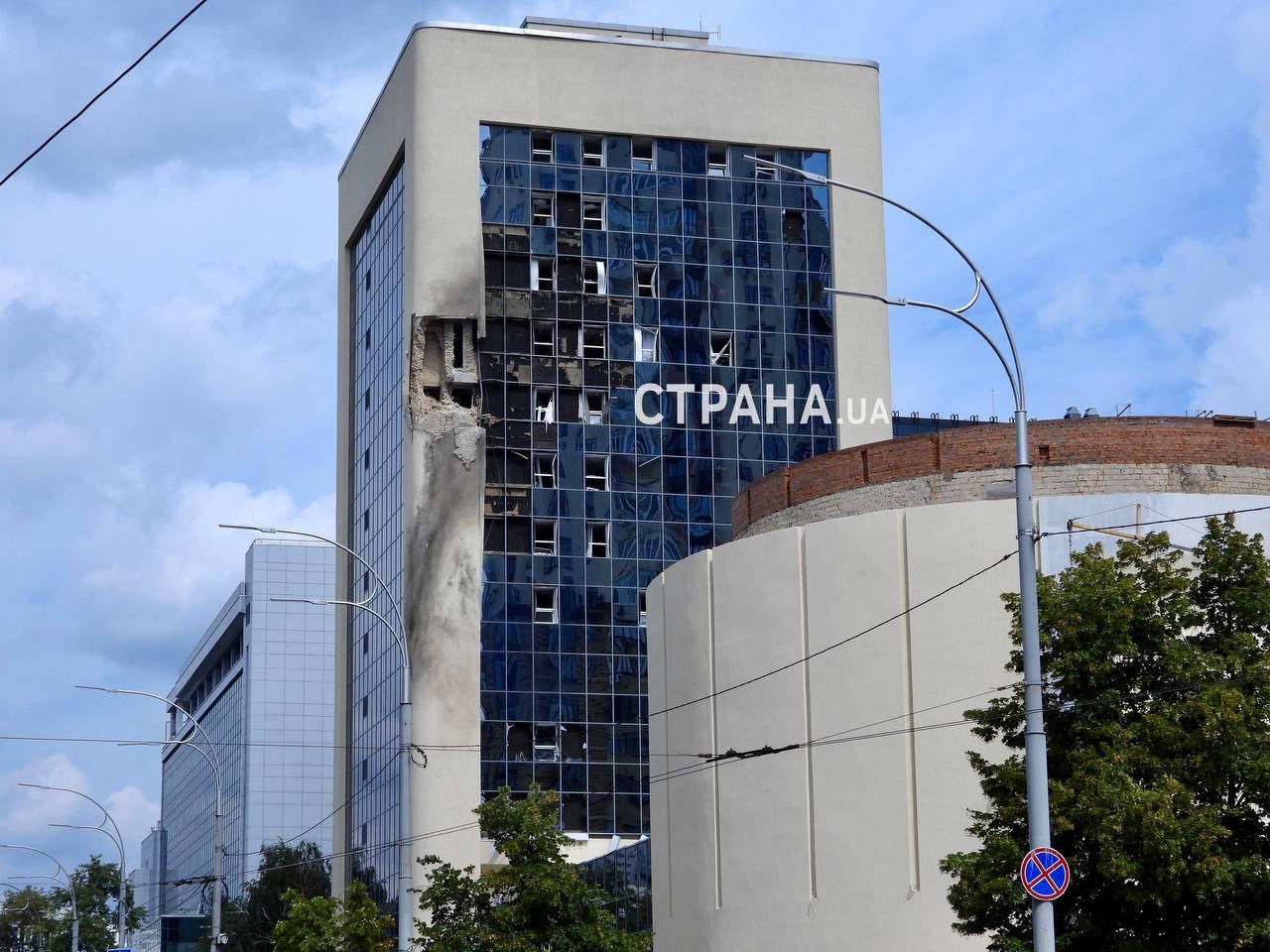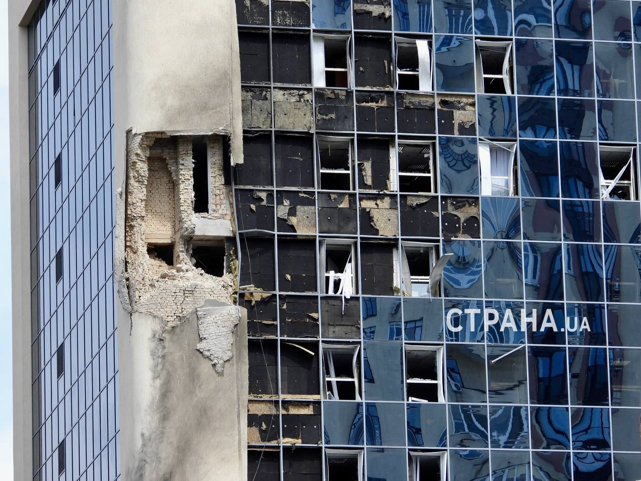 В Соломенском районе Киева после атаки "Шахедов" поврежден фасад административного здания с 9 по 11 этаж. Также осколками от взрыва выбило окна в соседних домах и магазинах.