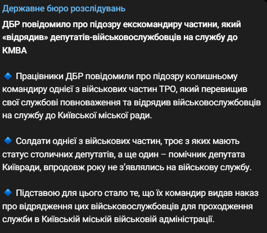 Государственное бюро расследований сообщило о подозрении бывшему командиру части воинской части ТРО, который превысил свои служебные полномочия и отправил депутатов-военнослужащих на службу в Киевский городской совет.