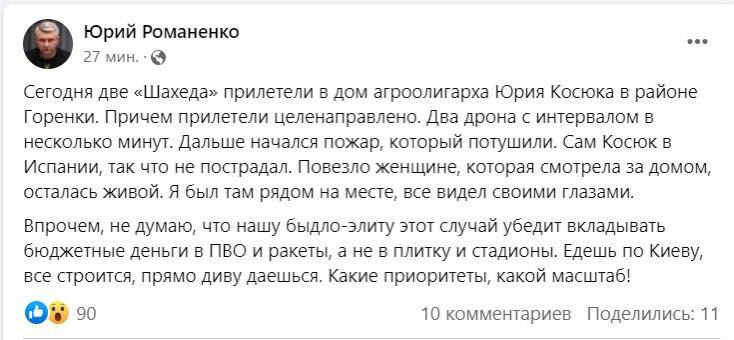 "Сегодня два "Шахеда" прилетели в дом агроолигарха Юрия Косюка в районе Горенки. Причем прилетели целенаправленно. Два дрона с интервалом в несколько минут. Дальше начался пожар, который потушили. Сам Косюк в Испании, так что не пострадал. Повезло женщине, которая смотрела за домом, осталась живой. Я был там рядом на месте, все видел своими глазами", – написал Романенко.