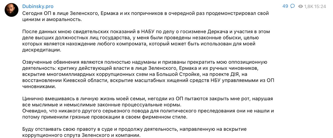 Дубинский связывает уголовное дело со своими показаниями в НАБУ против Владимира Зеленского и Андрея Ермака по делу о госизмене Андрея Деркача.