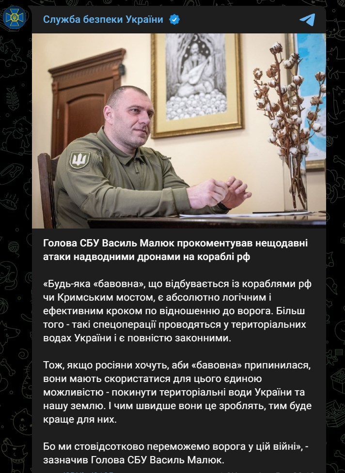 "Любая "бавовна", происходящая с кораблями РФ или Крымским мостом, является абсолютно логичным и эффективным шагом по отношению к врагу. Более того - такие спецоперации проводятся в территориальных водах Украины и полностью законны", - заявил глава СБУ Василий Малюк.