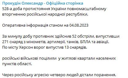 За минувшие сутки российские войска совершили 52 обстрела Херсонской области, выпустив 271 снаряд из минометов, артиллерии, танков, БПЛА и авиации. По городу Херсон враг выпустил 13 снарядов.