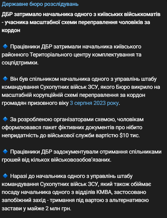 "По разработанной организаторами схеме, мужчинам оформлялся пакет фиктивных документов о якобы непригодности к военной службе стоимостью $10 тыс. Сотрудники ГБР задокументировали получение сообщниками денег от нескольких военнообязанных. В настоящее время к начальнику одного из управлений штаба командования Сухопутных войск ВСУ, который также занимает должность начальника одного из отделов КГВА, применена мера пресечения - содержание под стражей с альтернативой залога в почти 2 млн грн", - сообщает ГБР.