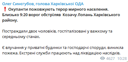Войска РФ сегодня около 9:20 обстреляли Казачью Лопань Харьковского района, пострадали двое мужчин, они госпитализированы.