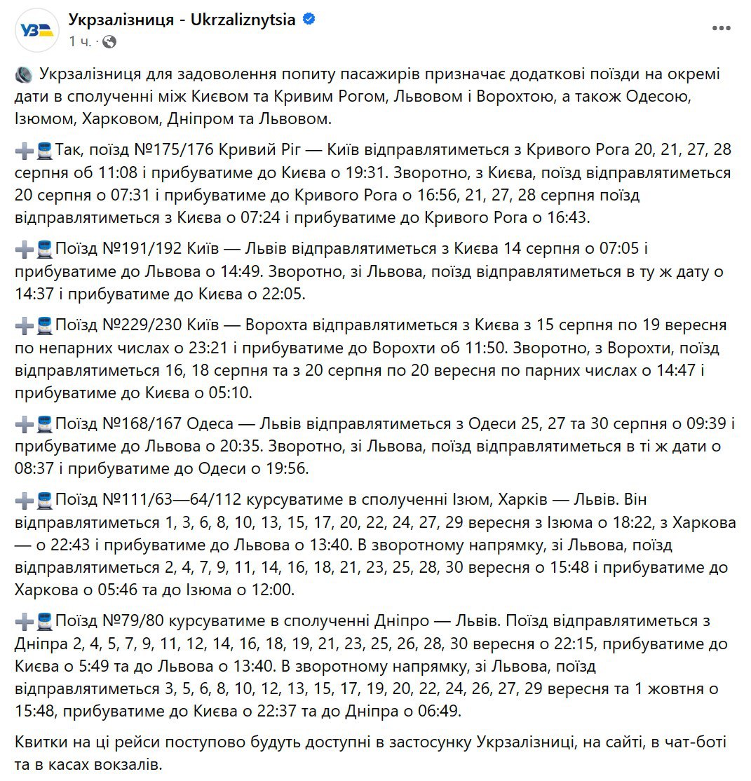 После публикации "Страны" о проблеме с дефицитом билетов "Укрзализныця" объявила, что запускает дополнительные поезда на отдельные даты в сообщении между Киевом и Кривым Рогом, Львовом и Ворохтой, а также Одессой, Изюмом, Харьковом, Днепром и Львовом.