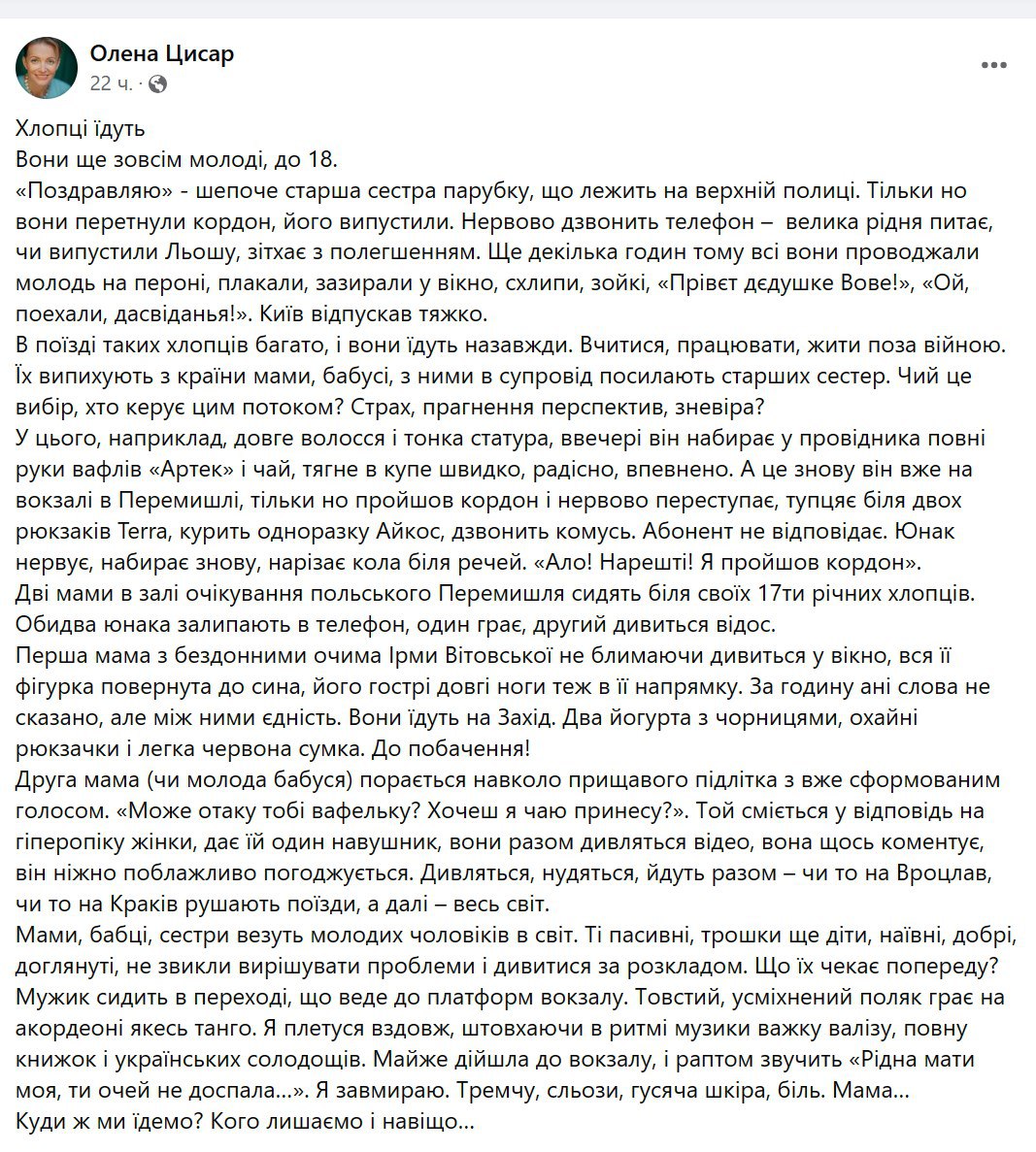 Киевлянка Елена Цисар, выезжая из Украины на поезде  сообщила, что "парни уезжают". Она наблюдала несколько ребят, которые пересекли границу и радостно сообщали об этом родственникам по телефону. Либо же их поздравляли с выездом сопровождающие члены семьи.