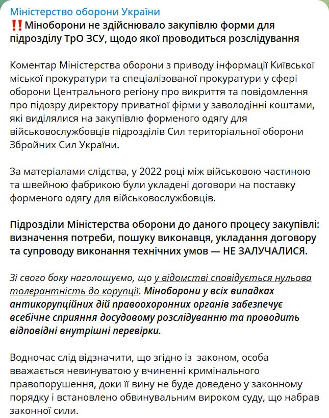 Министерство обороны Украины заявило, что непричастно к закупке некачественной формы для ВСУ.