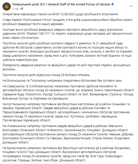 Война в Украине идет уже 535-й день. Мы следим за последними новостями и ключевыми событиями 12 августа 2023 года в онлайне.
