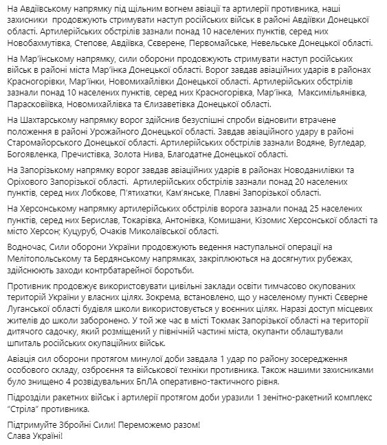 За прошедшие сутки на нескольких участках фронта произошло более 30 боестолкновений с российской армией. При этом украинские военные продолжают наступление на Мелитопольском и Бердянском направлениях, закрепляются на достигнутых рубежах и осуществляют меры контрбатарейной борьбы.