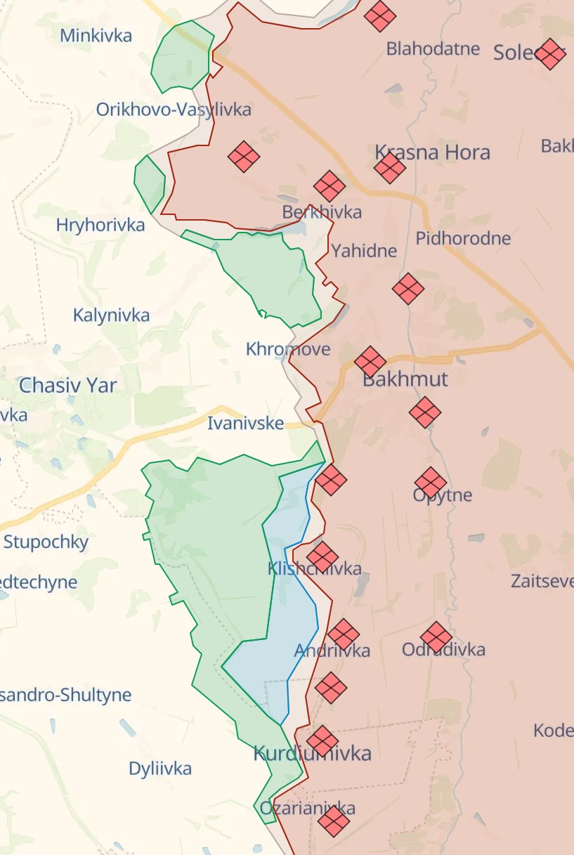 Продвижение у ВСУ есть под Андреевкой, но в само село, "где всего 25 домов", украинские войска не вошли. Цель на этом участке - перейти железнодорожные пути, которые с юга ведут в Бахмут.
