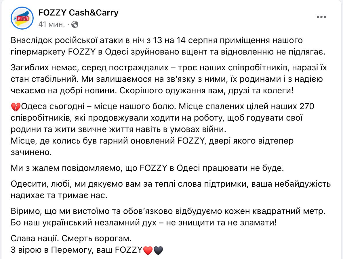 FOZZY заявляет о прекращении работы своего гипермаркета в Одессе.