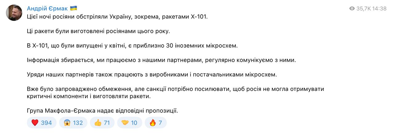 Ермак также написал, что сейчас нарабатываются предложения, как лишить Москву доступа к западным технологиям, и призвал усилить антироссийские санкции.