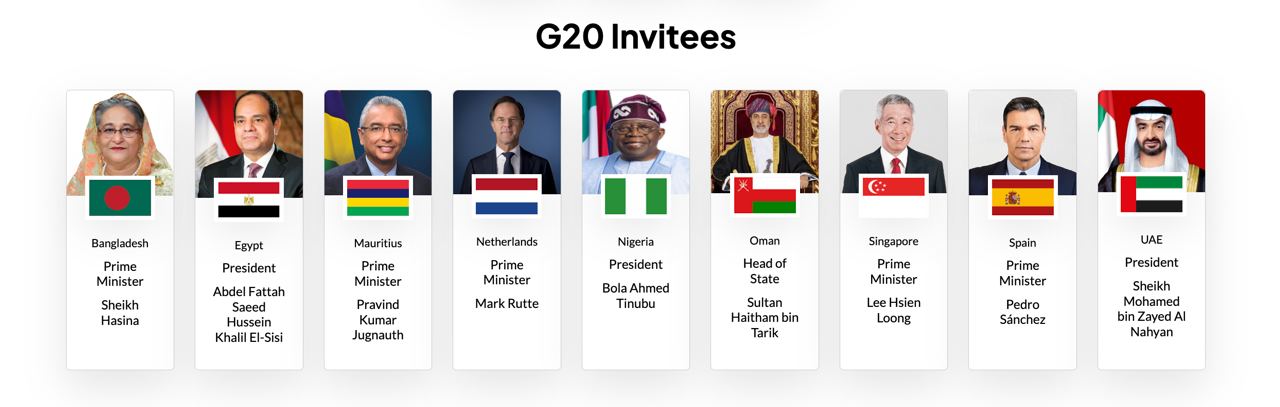Как заявляли в Индии, Украину не пригласили, так как она не входит в G20. Однако среди приглашенных есть представители стран, не входящих в "двадцатку": премьер-министр Бангладеша Шейх Хасина, президент Египта Абдель Фаттах Ас-Сиси, премьер-министр Нидерландов Марк Рютте, премьер-министр Сингапура Ли Сянь Лун, президент Испании Педро Санчес. Также в списке приглашенных значатся представители Маврикия, Нигерии, Омана и ОАЭ.