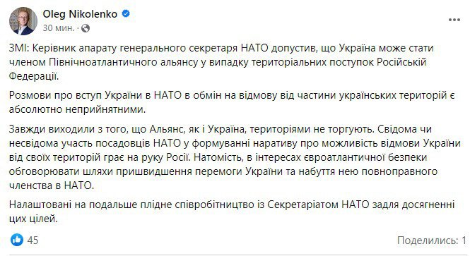 Так, спикер МИД Украины Олег Николенко заявил, что "разговоры о вступлении Украины в НАТО в обмен на отказ от части украинских территорий абсолютно неприемлемы".