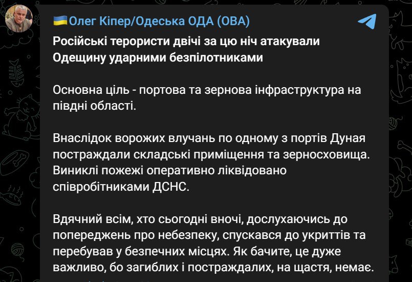 Как заявил губернатор Олег Кипер, в результате попаданий по одному из портов Дуная пострадали складские помещения и зернохранилища. Возникшие пожары ликвидированы.