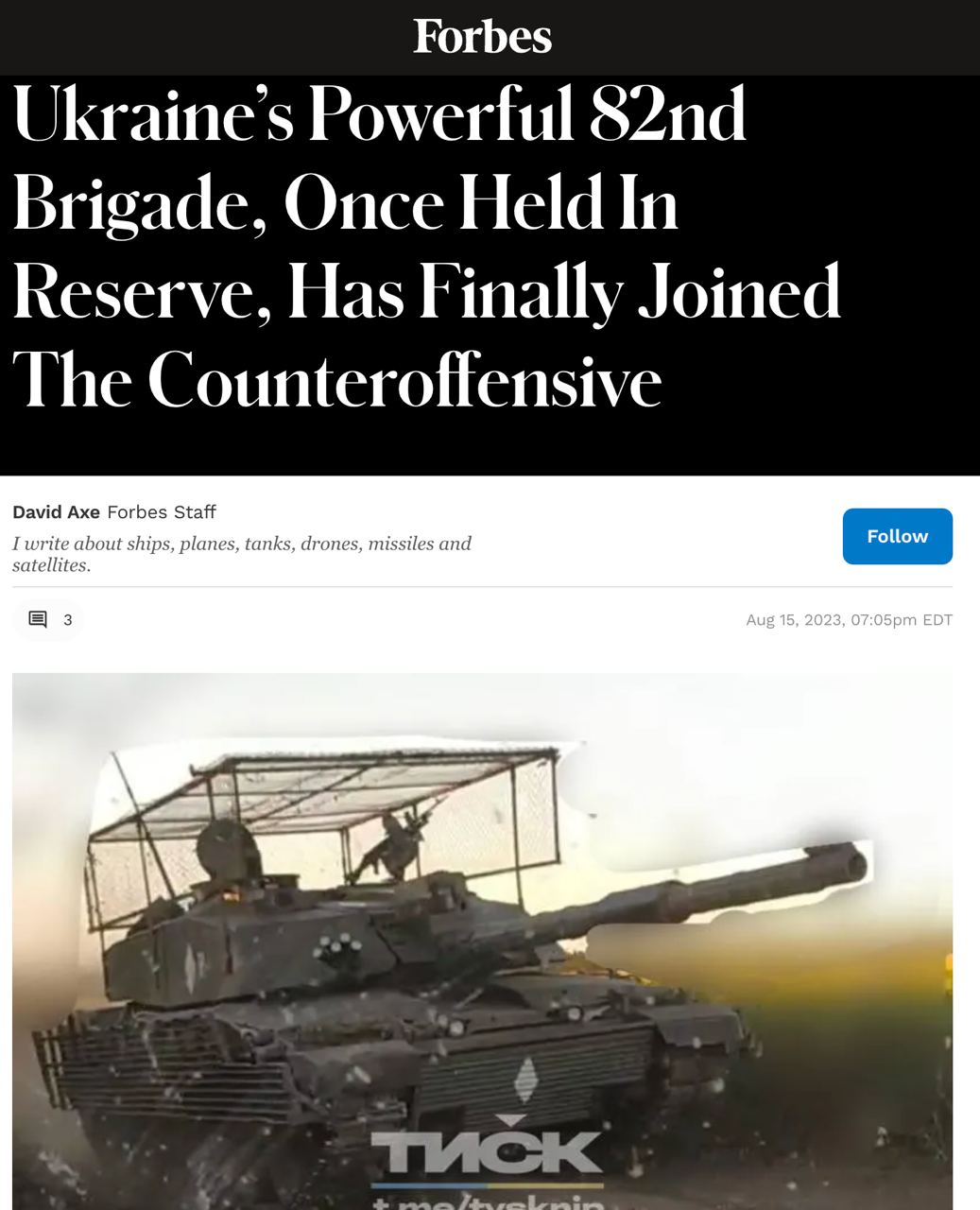 14.40 Украина бросила в бой одну из последних резервных бригад, подготовленную для текущего наступления на юге, сообщает Forbes.