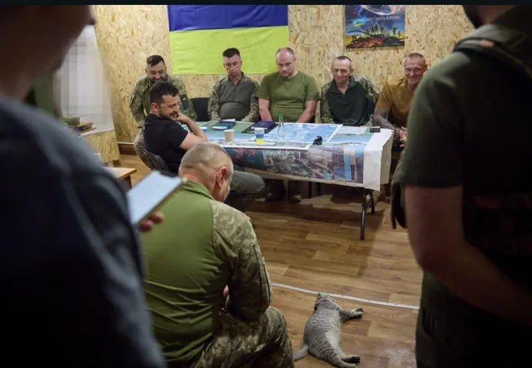 14.45 Паблики обратили внимание на фотографию с Зеленским, военными и котом.