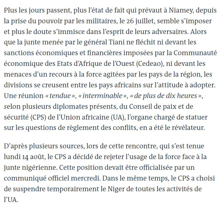 Таким образом, Африканский союз, указывает газета, "выражает несогласие с ЭКОВАС, которое, считая мирный диалог приоритетом, привело в готовность свои вооруженных формирования".