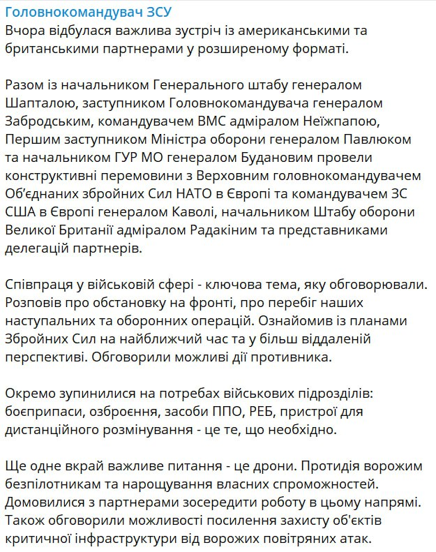 Об этом сообщил главнокомандующий ВСУ Валерий Залужный в своем телеграм-канале по итогам расширенной встречи высшего военного руководства Украины с представителями партнеров и главнокомандующим Объединенными силами НАТО в Европе генералом Каволи.