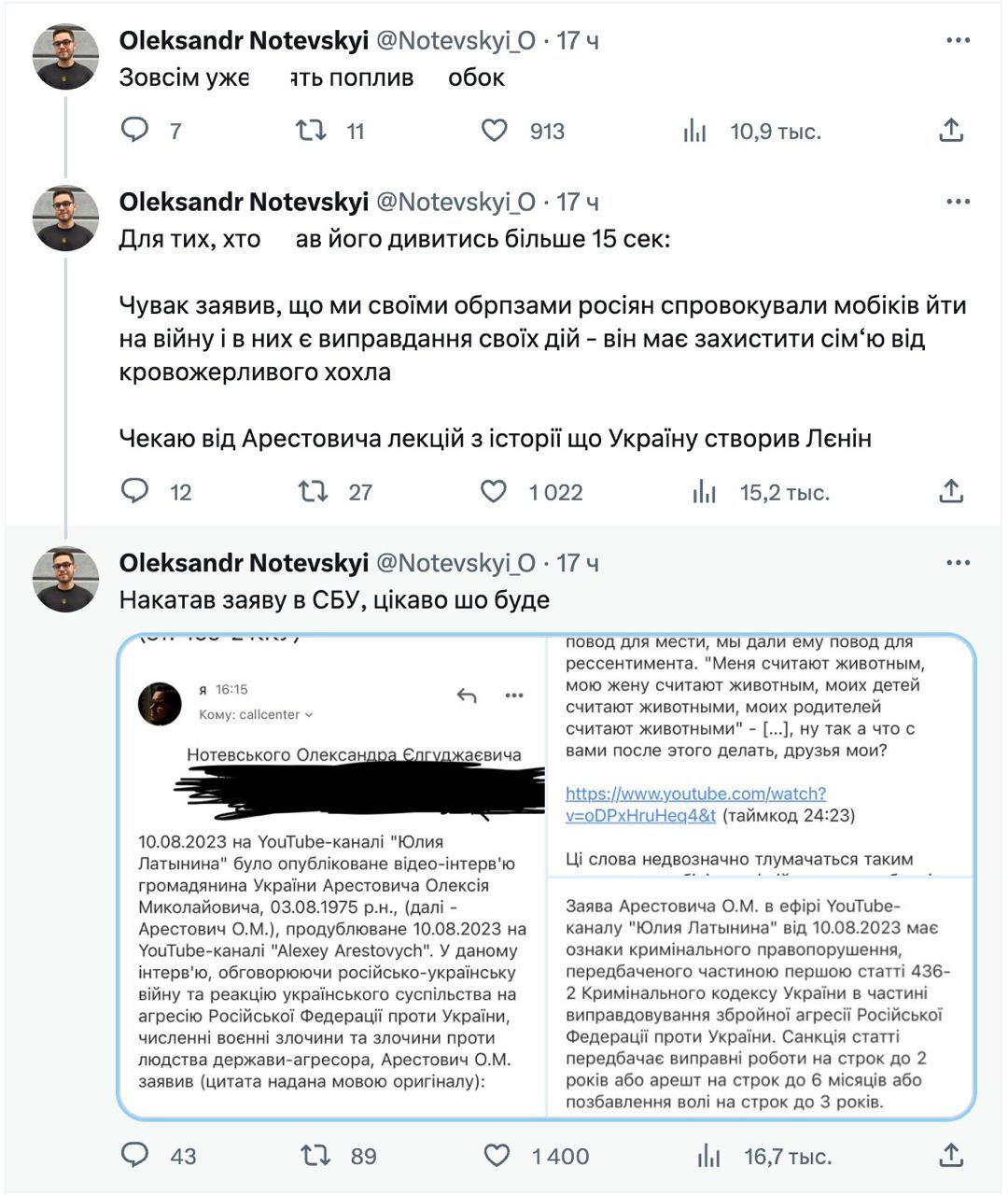 Он опубликовал заявление, которое отправил в СБУ, с просьбой провести расследование и дать правовую квалификацию словам Арестовича, потому что их, по его мнению, можно трактовать таким образом, что у мобилизованных россиян есть оправдание для участия в войне против Украины.