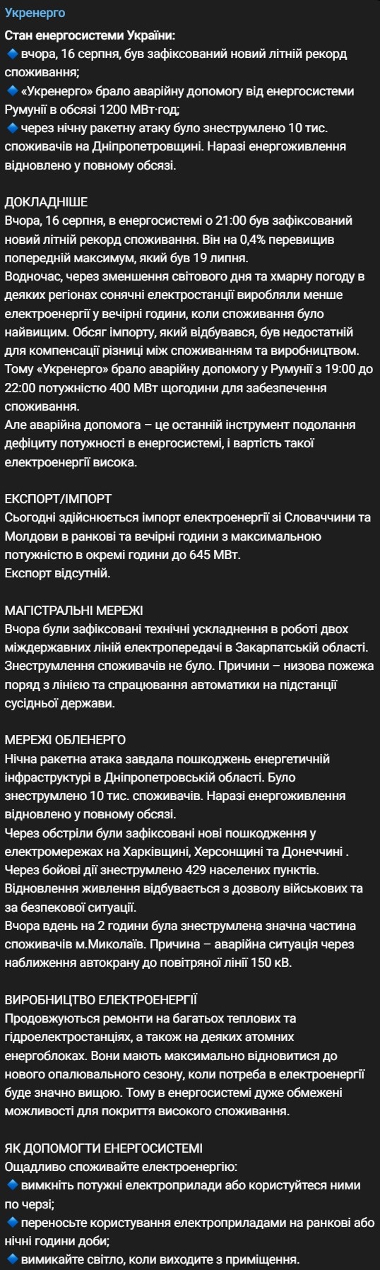 Вчера, 16 августа, в Украине был зафиксирован новый летний рекорд потребления, поэтому из энергосистемы Румынии осуществлялась аварийная помощь.