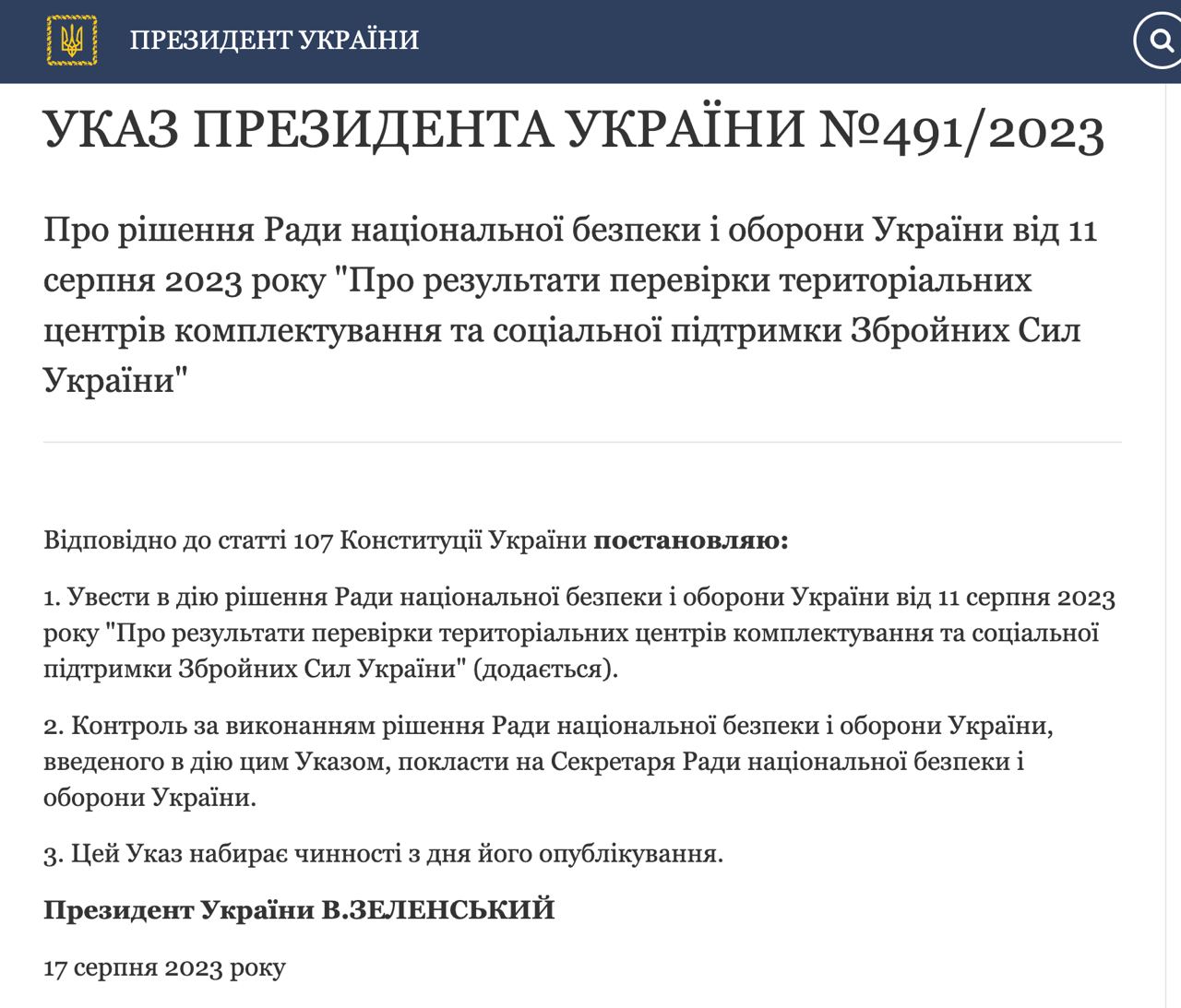 Документ под №491/2023 появился на сайте президента.